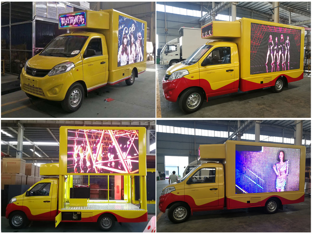廣告車選裝配置:客戶可根據(jù)需求選裝屏幕清晰度(P10彩屏、P8彩屏、P6彩屏、P5彩屏、P4彩屏)、單面彩屏、