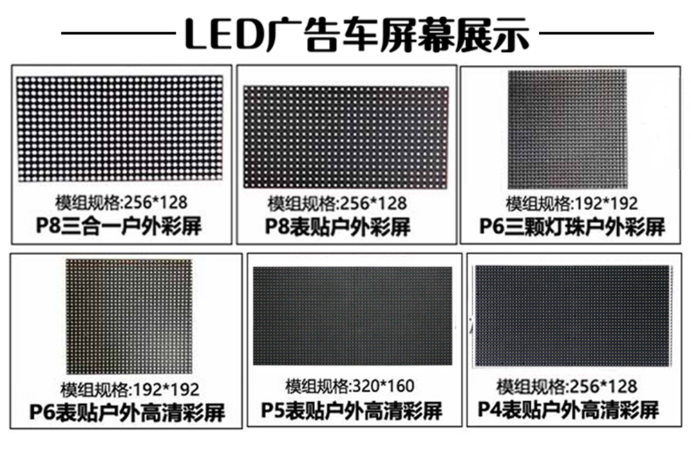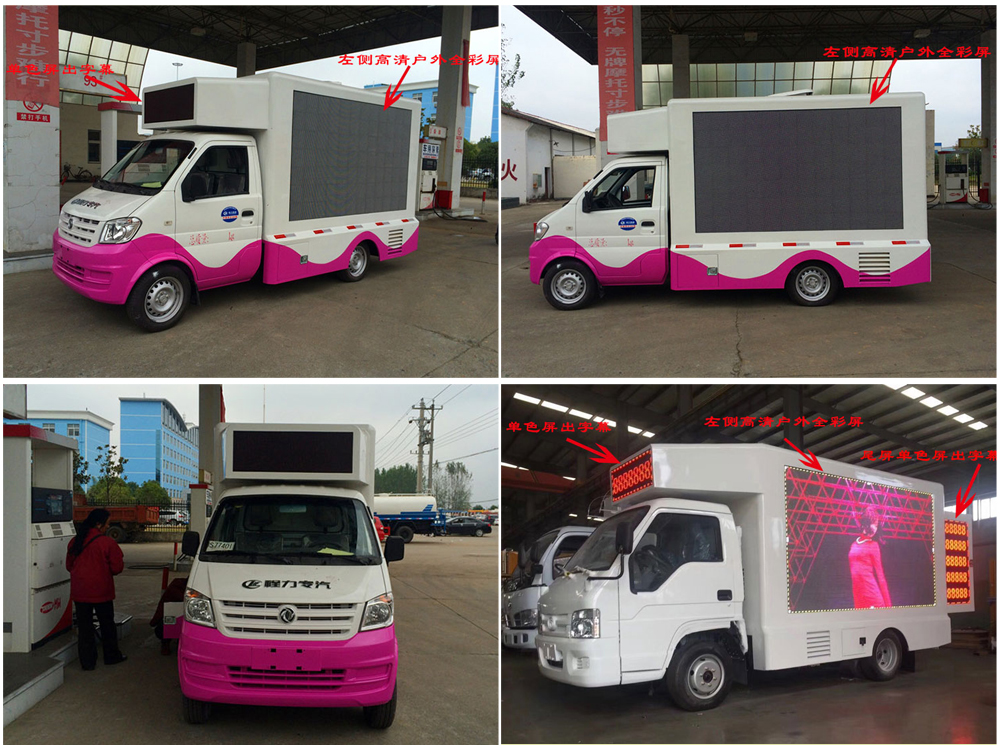 廣告車選裝配置:客戶可根據(jù)需求選裝屏幕清晰度(P10彩屏、P8彩屏、P6彩屏、P5彩屏、P4彩屏)、單面彩屏、雙面彩屏、雙面