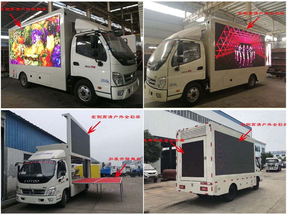 廣告車選裝配置:客戶可根據(jù)需求選裝屏幕清晰度(P10彩屏、P8彩屏、P6彩屏、P5彩屏、P4彩屏)、單面彩屏、雙面彩屏、雙面